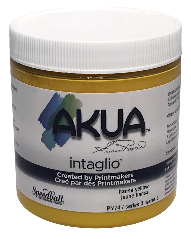 Professional printmaker, Susan Rostow, developed Akua Intaglio Inks to deliver brilliant colors and intense blacks. Akua Intaglio Inks only dry through absorption and will not dry on the printing plate. Cleans up easily with soap and water. These unique properties make them ideal for the classroom as there is no waste at all. Inks can be used to the very last drop because they will not dry or skin in the jar and equipment is not ruined from rushed cleanup. Ideal for Intaglio/Etching, Monotype, Relief, Collagraph and Gel Printing and can be used with Akua Liquid Pigment and select Akua Modifiers. AP non-toxic. Comes in an 8 fluid ounce (240 ml) jar.