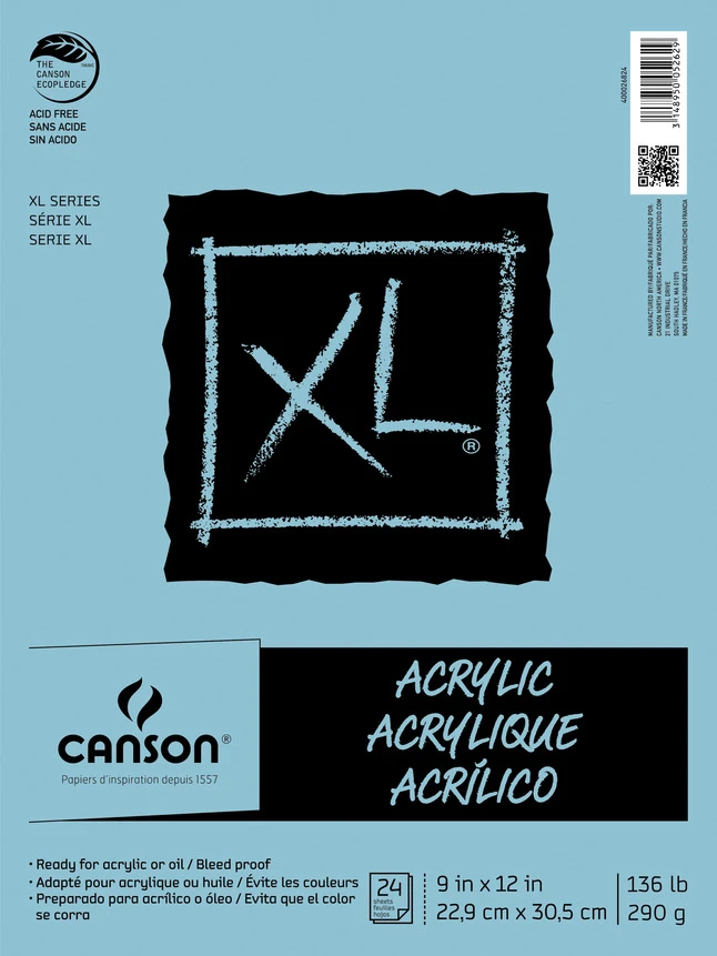 Canson XL Acrylic Pad measuring 9 x 12 inches contains 24 sheets and features canvas, textured paper that can be used with oil without any priming or preparation.
