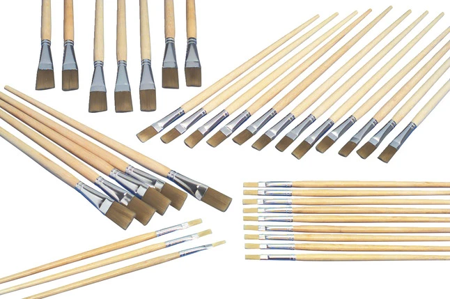 - Assorted brush types include white bristle, black bristle, synthetic and camel hair