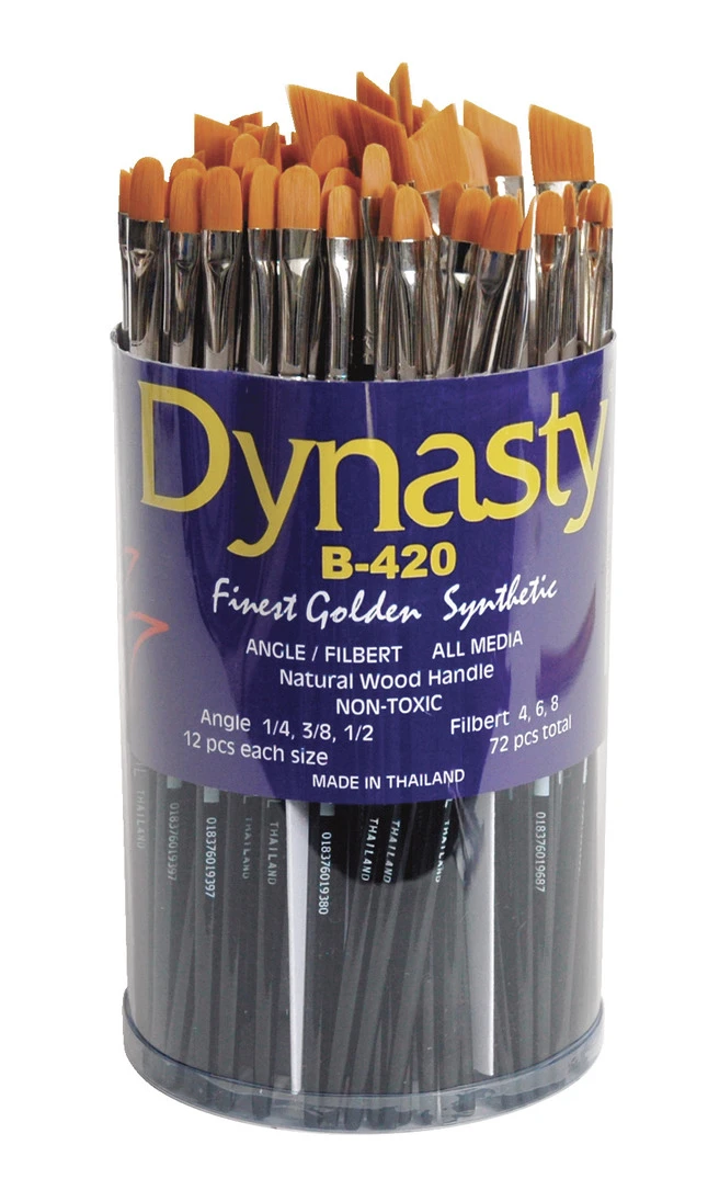 Dynasty B-420 Golden Synthetic Short Handle Paint Brush Set of 72 comes in a canister that includes 12 each of 1/4 in, 3/8 in, 1/2 in angles and sizes 4, 6, 8 filberts. This is perfect for oil and acrylic painting as well as all types of craft projects. Top quality brush features seamless ferrules and short wood handles. Sold as 72 per set.