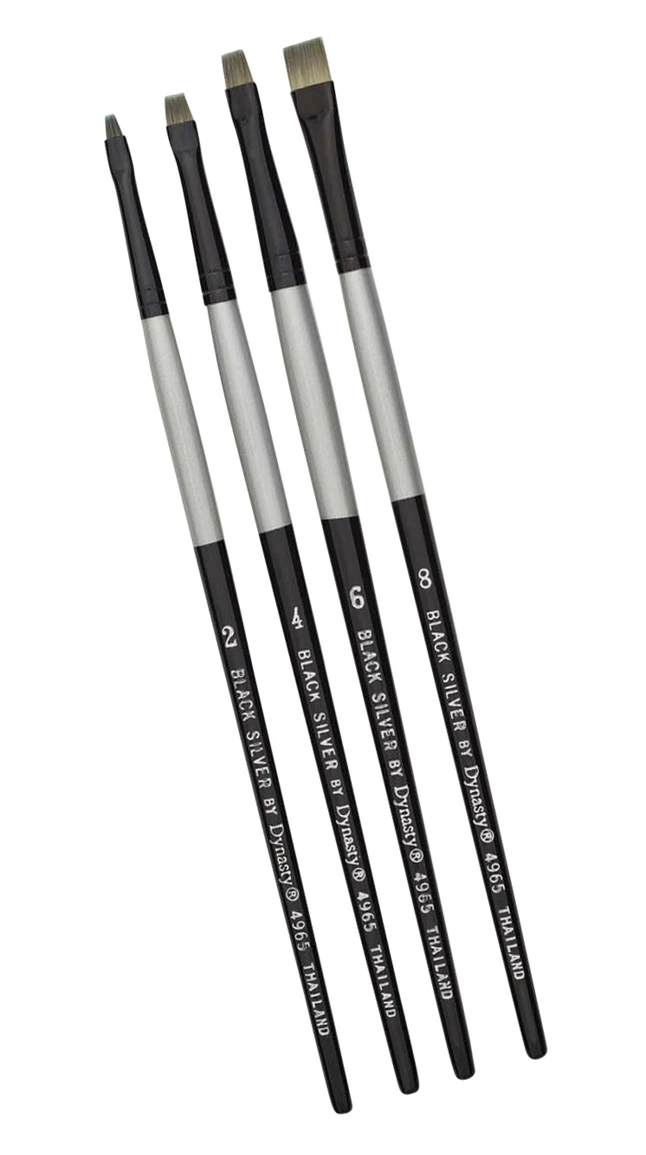 Dynasty’s short handle Black Silver brushes are versatile, affordable, and elegant for all artists. Black Silver brushes are made from many types of synthetics that maintain chisel and point while holding the pigment of any medium with its sizable reservoir. Great addition to any painting project for at home and school use.