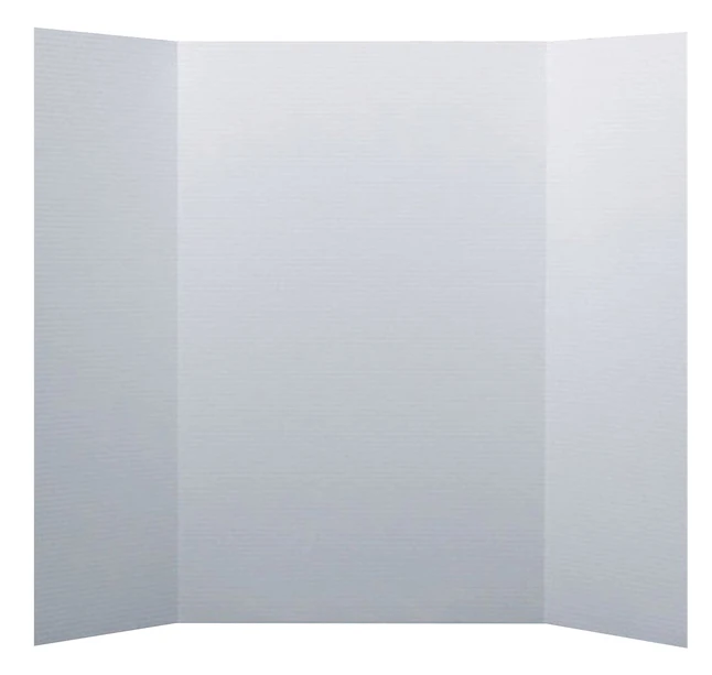 Mini Corrugate Tri-Fold Display Board in white measures 14 x 22 inches when opened and 14 x 11 inches when closed. Board is designed for smaller projects such as book reports, displays and signage. Self-standing board featuring a smooth surface is light in weight and easy to transport. Sturdy corrugated board features white inside and a natural kraft outside.