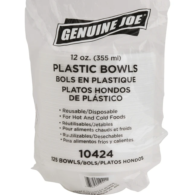Genuine Joe White 12 oz Plastic Bowl is ideal for breakrooms, parties and picnics. Plastic bowl is reusable and disposable. Sold as 125 per pack.