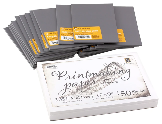 Jack Richeson Printmaking Classroom Pack includes 24 – 4 x 6 inch Easy-to-Cut Unmounted Linoleum pieces and 50 sheets of 6 x 9 inch 135# printmaking paper. Easy-to-Cut linoleum cuts like butter, leaves clean edges, and works well on curves and tight corners. It is double-sided and does not become brittle. Printmaking paper is ideal for a wide variety of printmaking techniques. 90 GSM and Acid-Free.