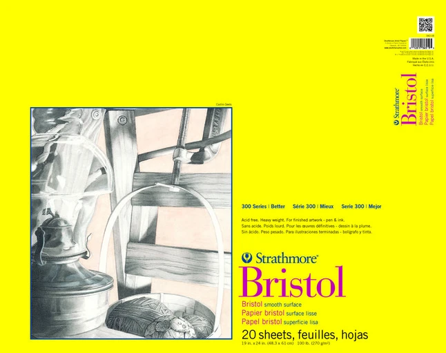 Strathmore 300 Series Bristol Pad has an affordable drawing surface, ideal for student work. It features smooth surface that is perfect for mechanical drawing, marker, airbrush, pen and ink. Tape bound pad measuring 19 x 24 inches contains 20 sheets of 100 lb basis weight Acid-Free paper.