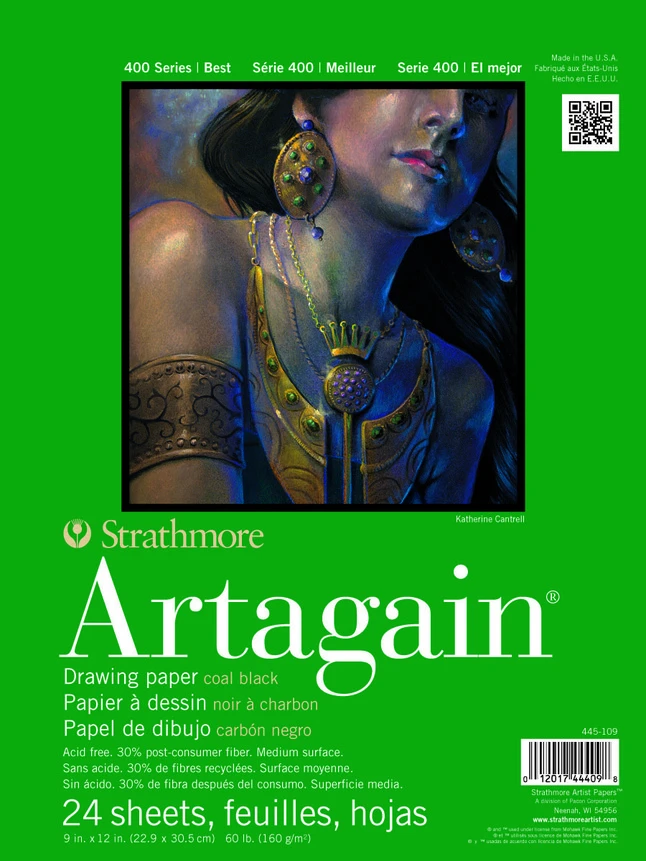 Strathmore Artagain Black Glue Bound Dry Media Drawing Pad features artist-quality recycled drawing paper with a beautiful flannel like surface that enhances any dry media work. Recycled paper is machine made and contains 30% post consumer fiber. Pad measuring 9 x 12 inches contains 24 sheets of 60 lb basis weight acid-free paper.
